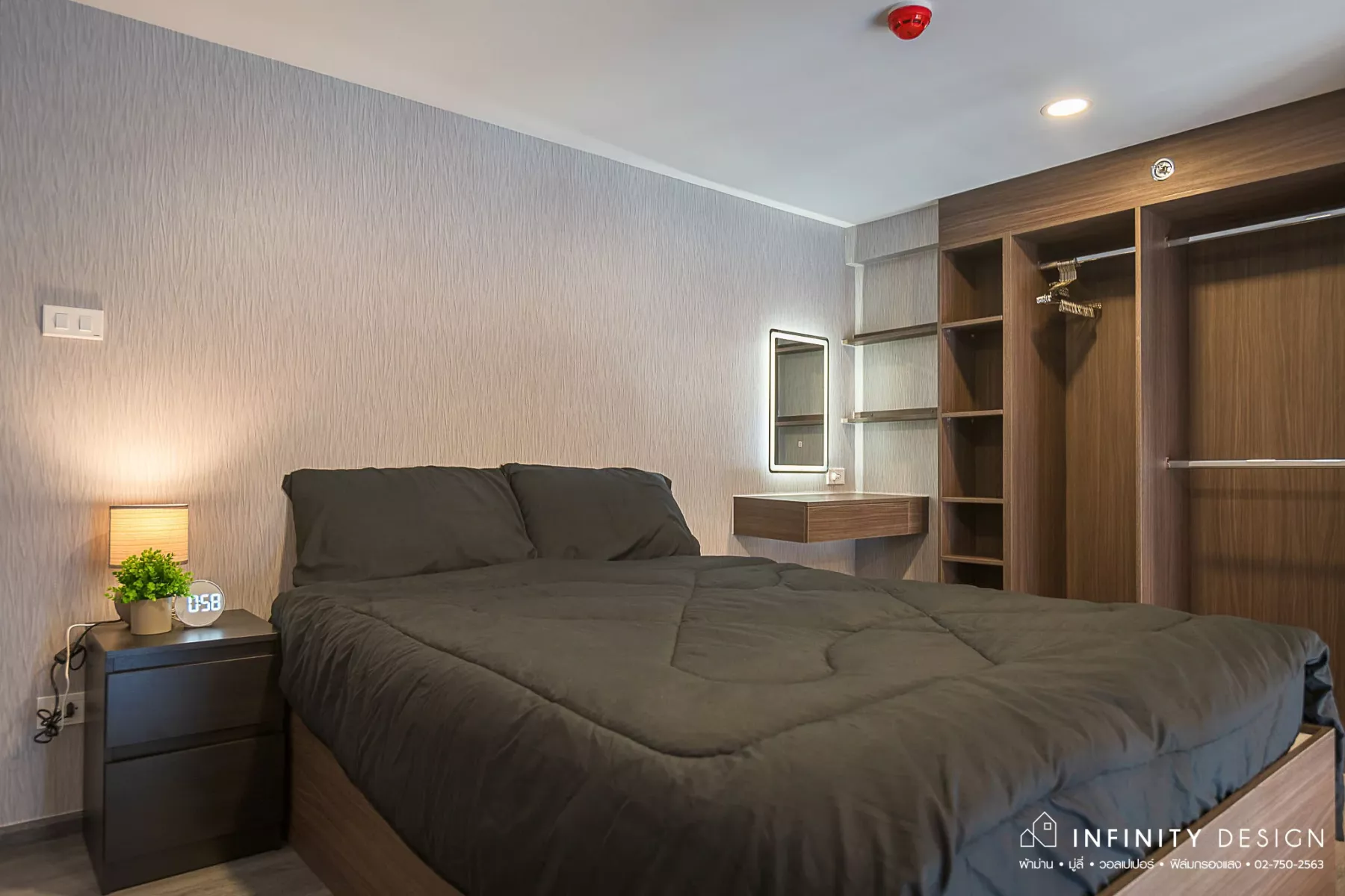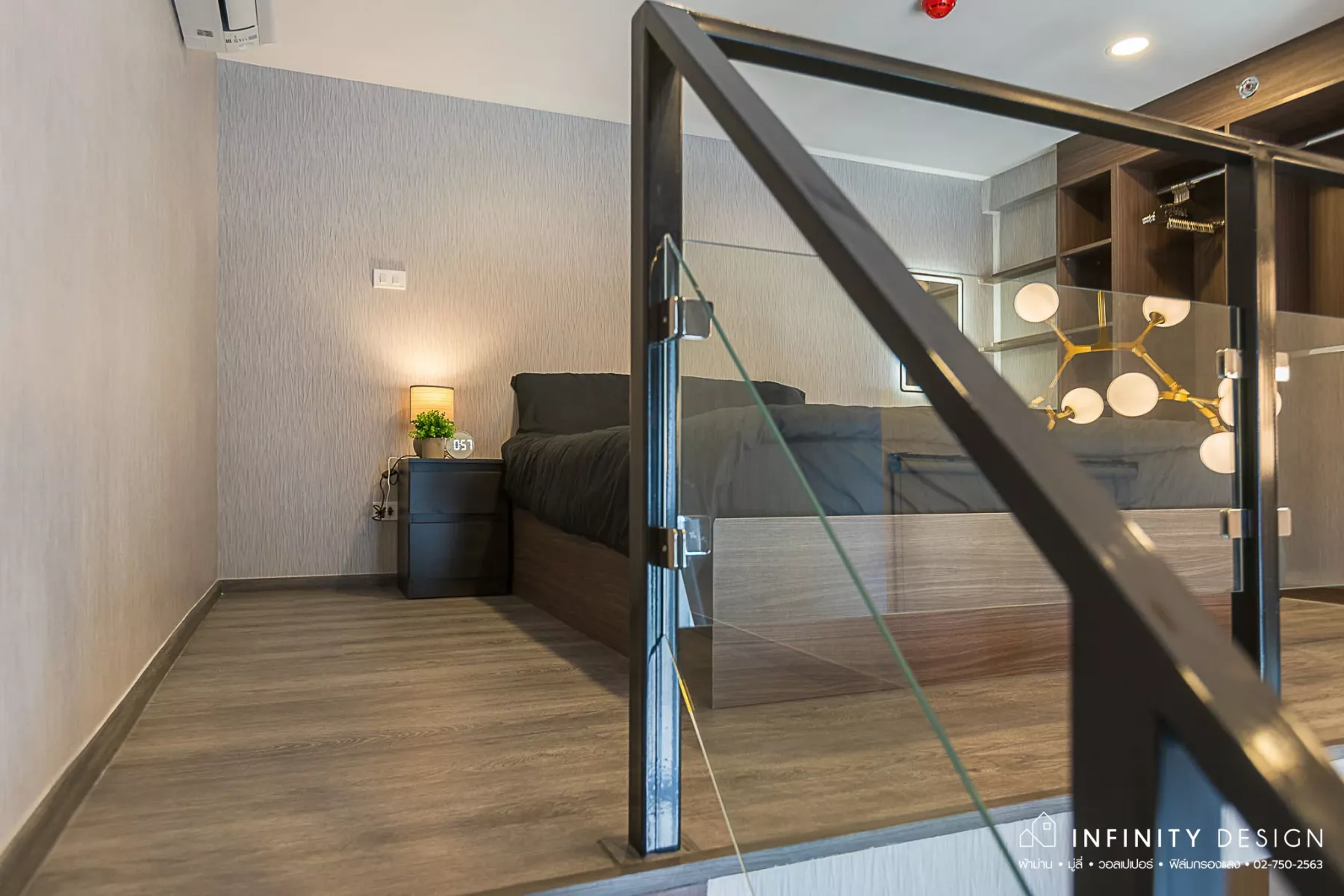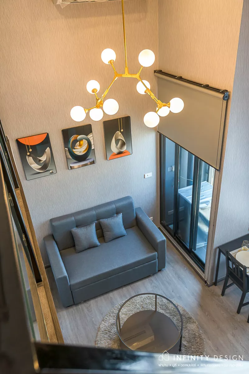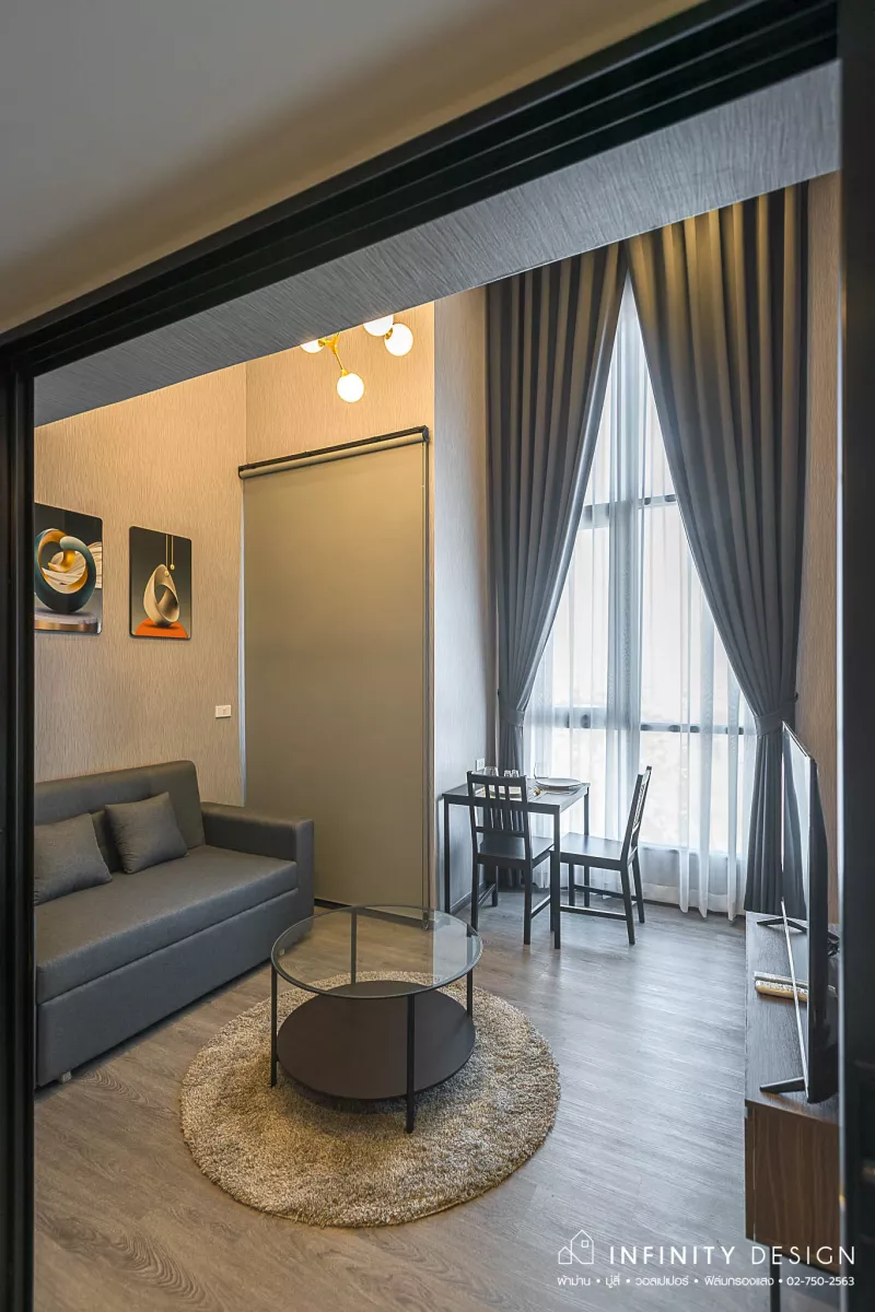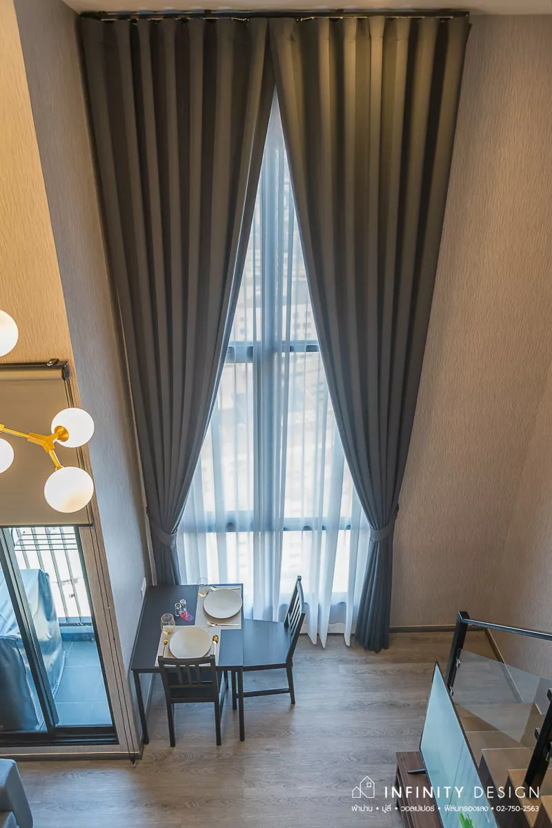 ผลงานการตกแต่งคอนโด The Origin ลาดพร้าว-บางกะปิ แบบ Duo Space (เพดานสูง) ในสไตล์ Modern ที่ทีม INFINITY DESIGN ตกแต่งด้วย ผ้าม่าน (Curtain) และ วอลเปเปอร์ (Wallpaper) โทนสีเทา เรียบง่าย แต่เท่