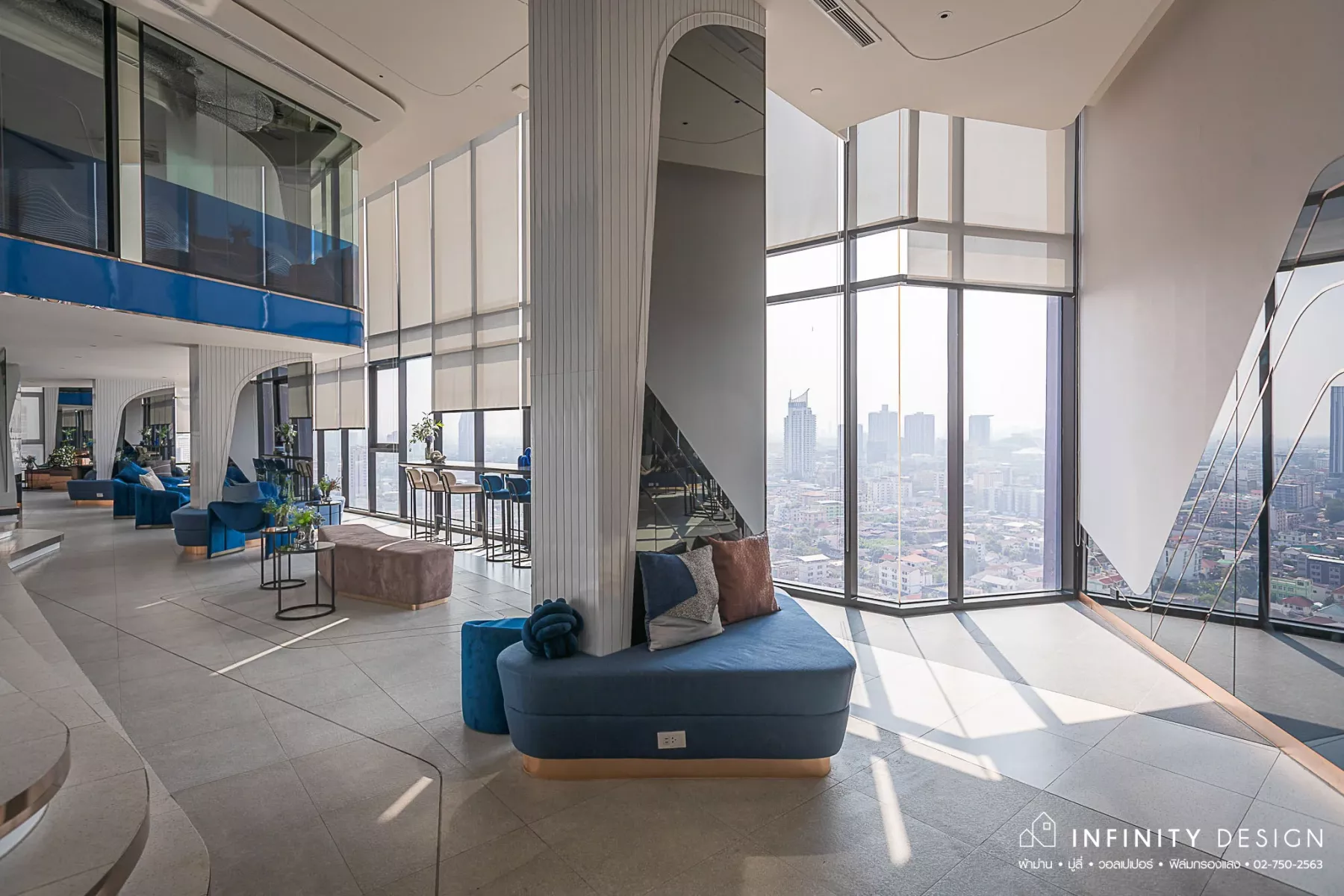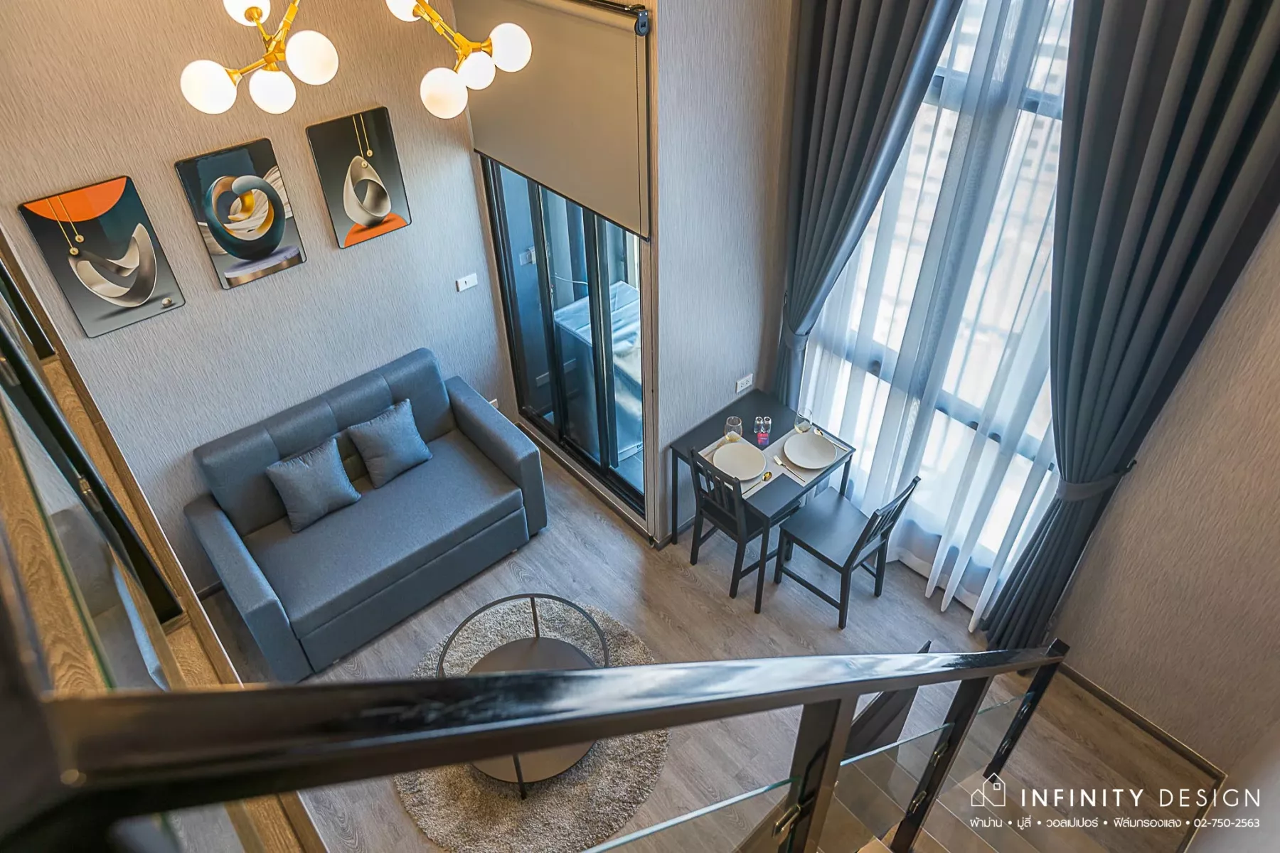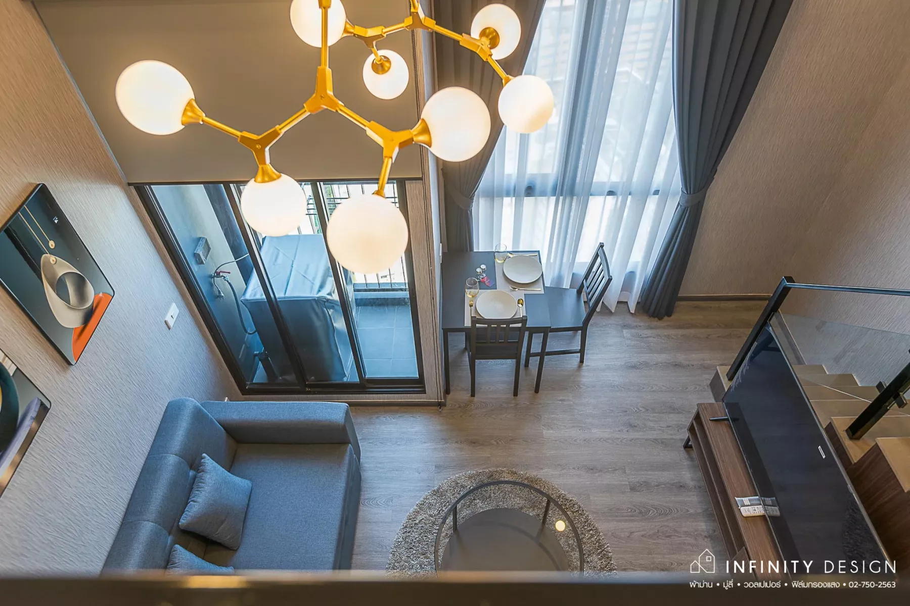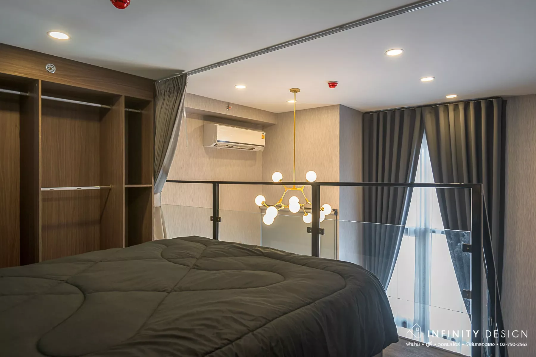 ผลงานการตกแต่งคอนโด The Origin ลาดพร้าว-บางกะปิ แบบ Duo Space (เพดานสูง) ในสไตล์ Modern ที่ทีม INFINITY DESIGN ตกแต่งด้วย ผ้าม่าน (Curtain) และ วอลเปเปอร์ (Wallpaper) โทนสีเทา เรียบง่าย แต่เท่