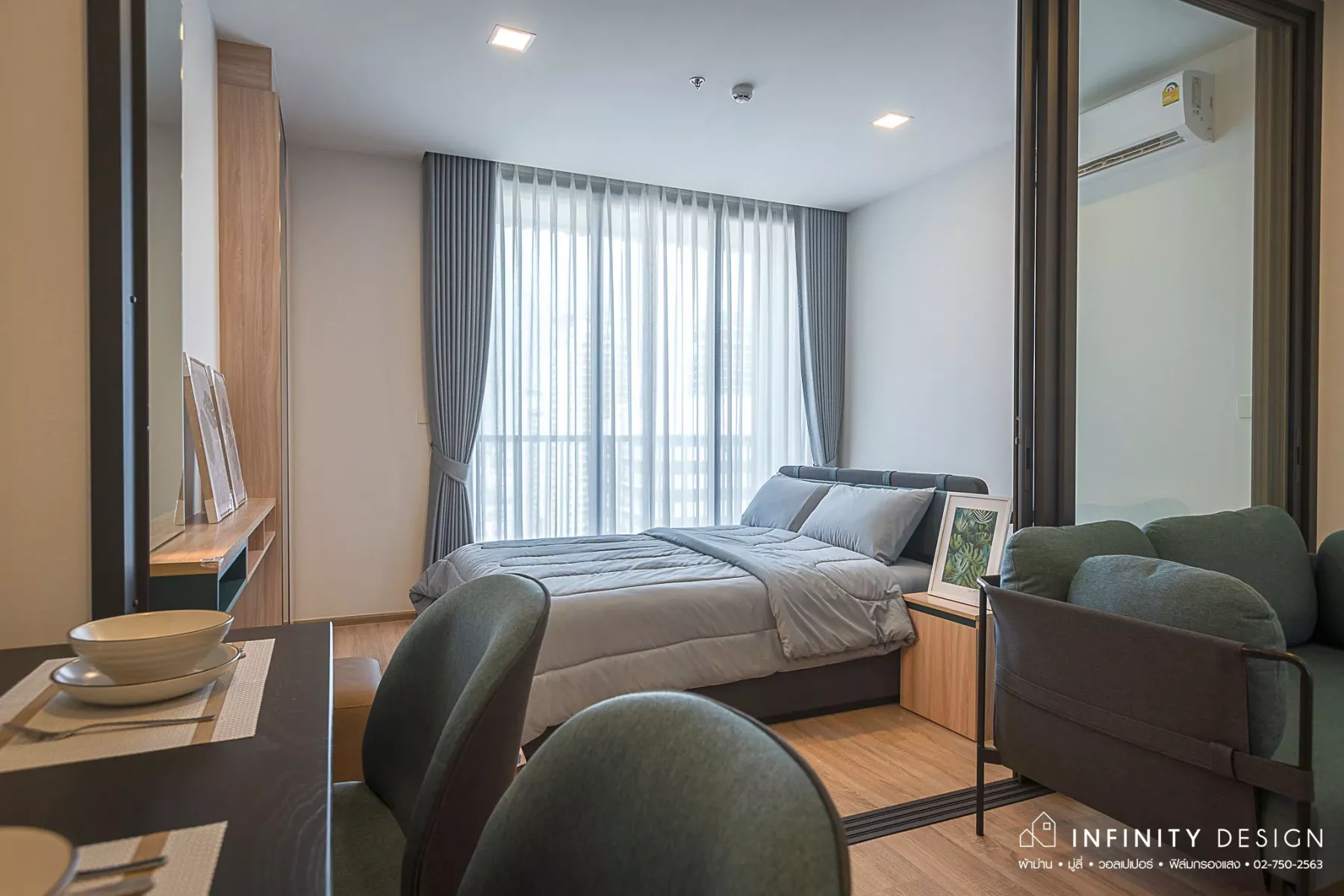 ผลงานการตกแต่งคอนโด XT พญาไท by Sansiri ขนาดห้อง 1 Bedroom ที่ INFINITY DESIGN ตั้งใจตกแต่งในสไตล์ Modern ด้วย ผ้าม่าน (Curtain) และ วอลเปเปอร์ (Wallpaper) โทนสีเทา ที่มาคู่กับการตกแต่งสไตล์นี้โดยเฉพาะ แต่ยังไงก็ไม่มีเอาท์