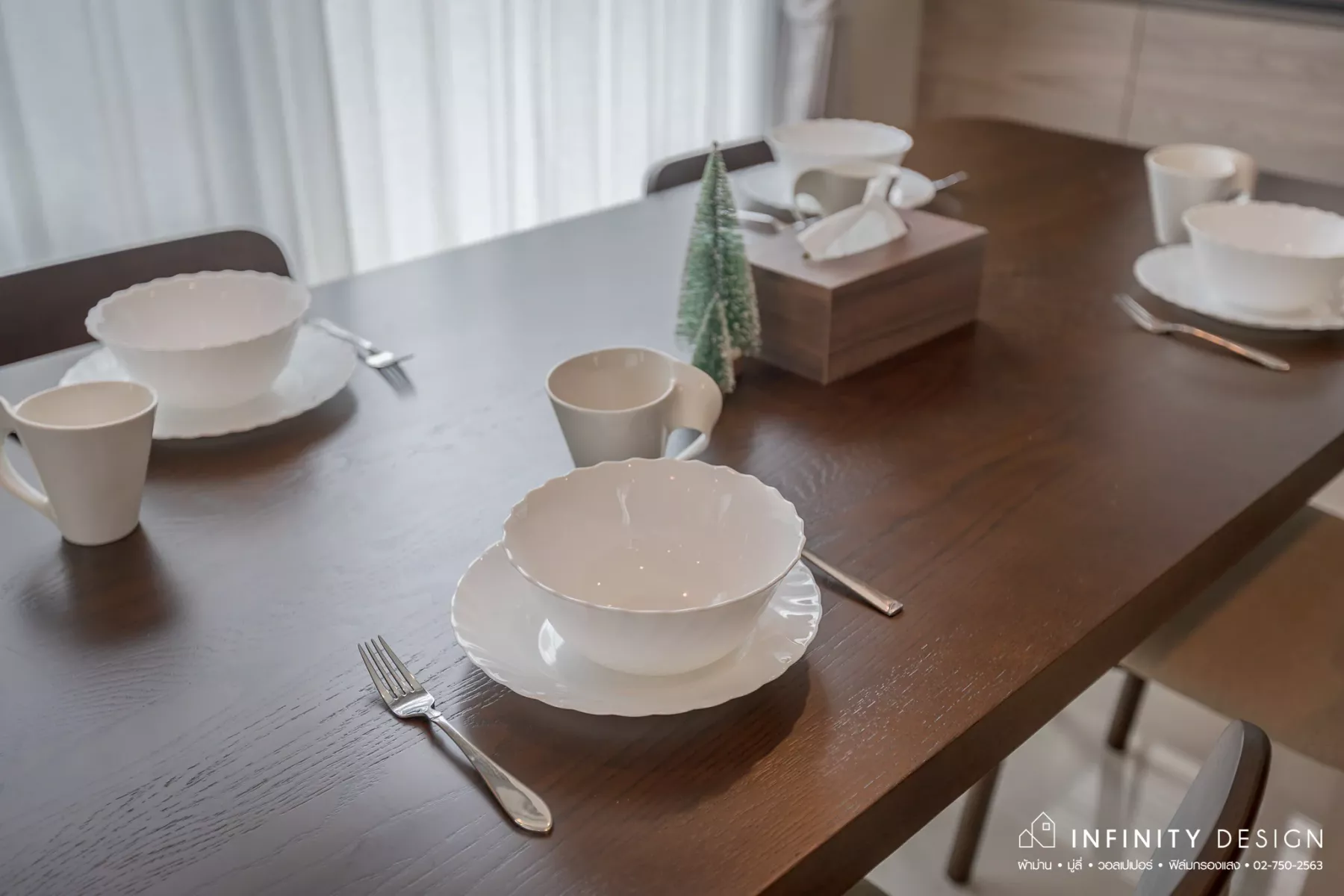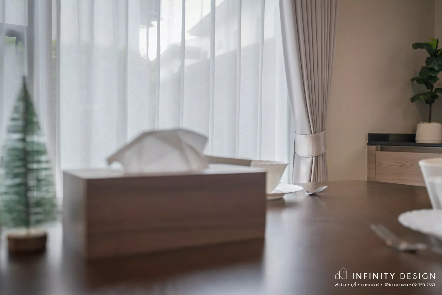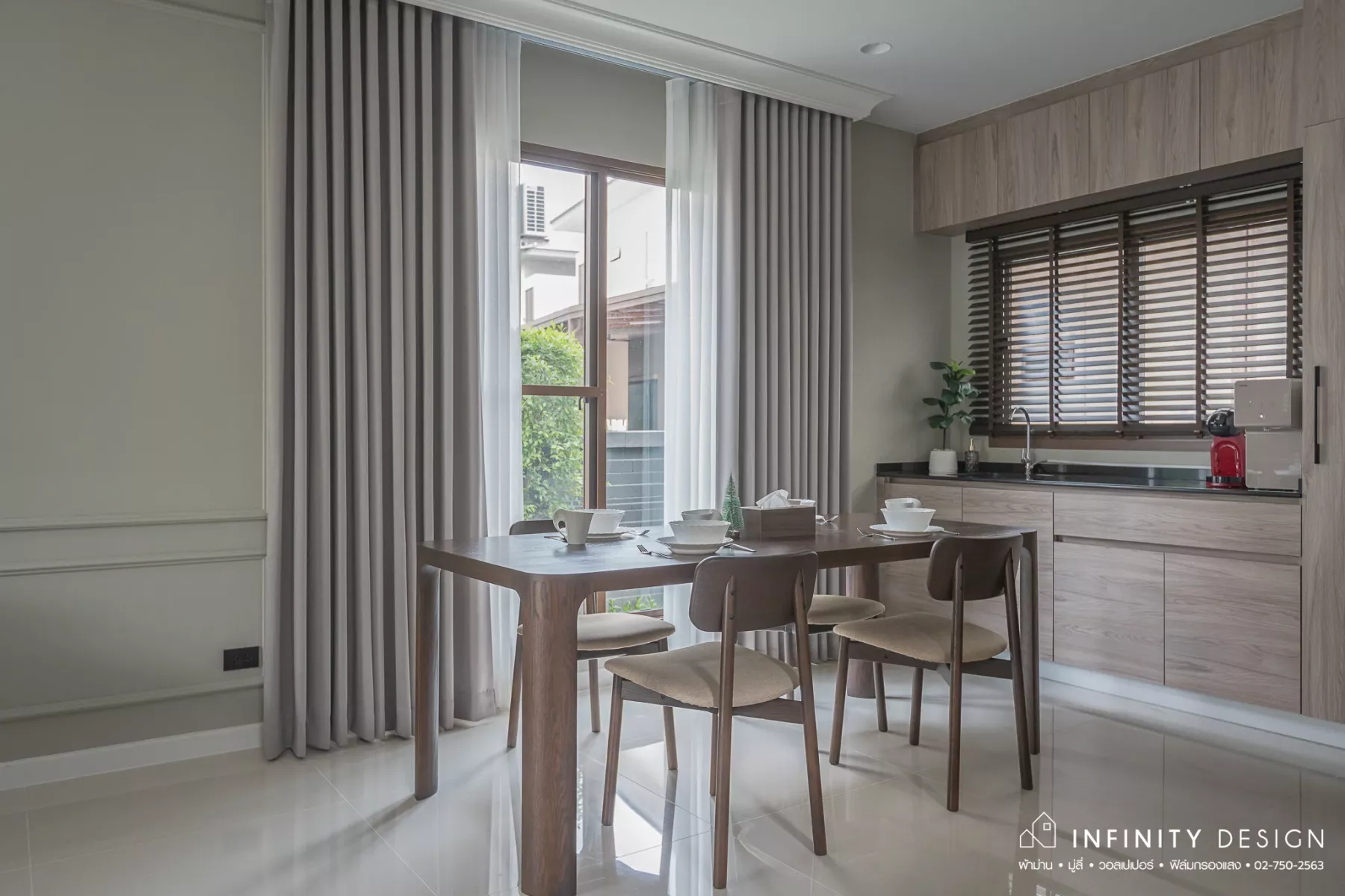 ส่วนมุมรับประทานอาหารฝั่งประตูออกสวนข้างบ้านตกแต่งด้วย ผ้าม่าน (Curtain) ชนิด ผ้าม่านลอน (Wave Curtains) และบานหน้าต่างหลังบ้านด้วย มู่ลี่ไม้ (Venetian Wooden Blinds) วัสดุเข้ากันกับบิวท์อิน