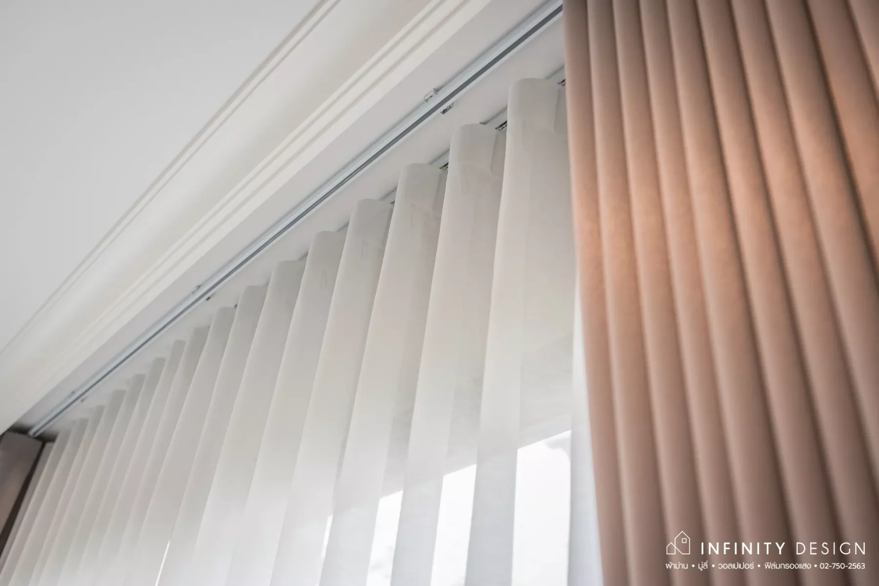 โดยทีม DECORISTA แนะนำให้ตกแต่งด้วยชนิด ผ้าม่านลอน (Wave Curtains) ทั้งผ้าม่านกันแสงและผ้าม่านโปร่ง ซึ่งบริเวณหัวผ้าม่านจะไม่มีการจับจีบ จะปล่อยหัวผ้าม่านให้เป็นลอนโค้งอิสระ