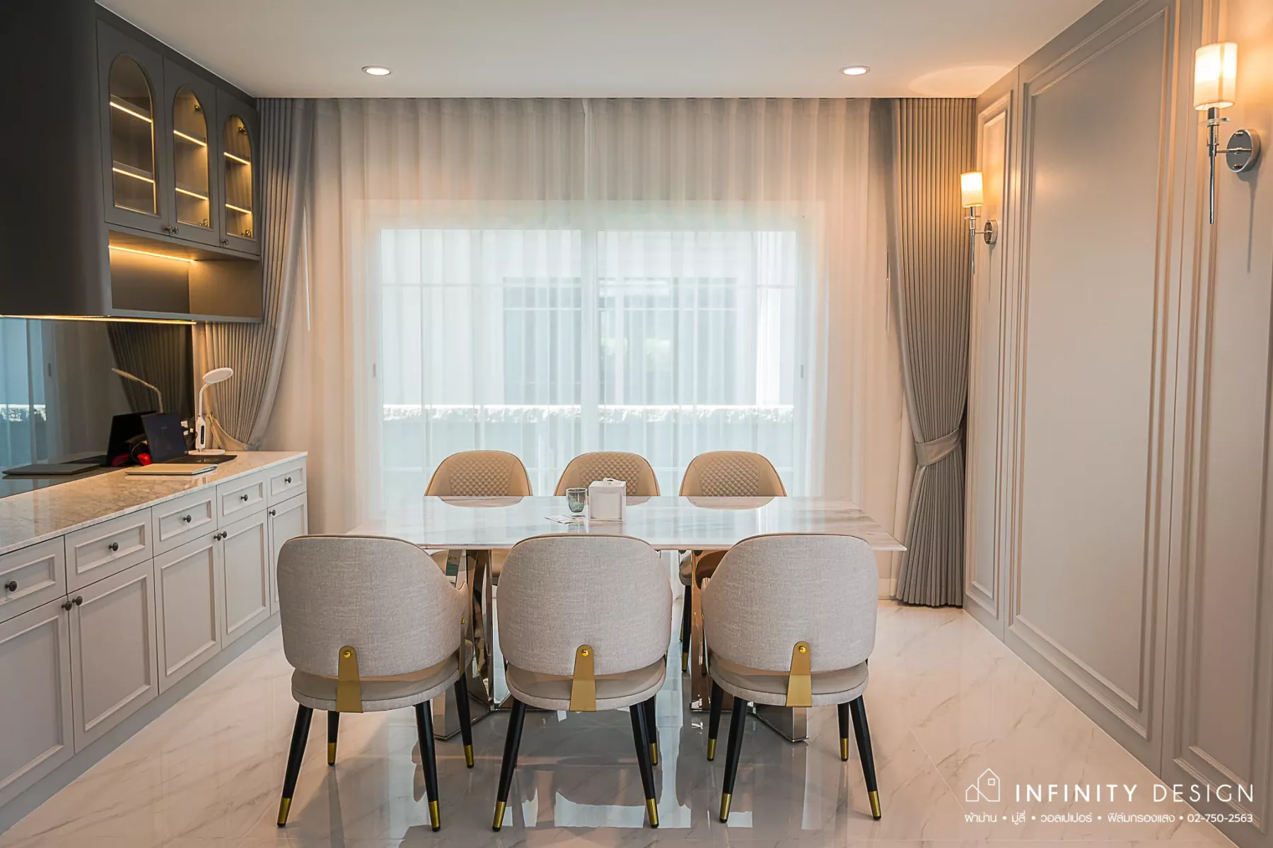 ส่วนมุมรับประทานอาหารก็หรูหราไม่แพ้กัน มีการคุมโทนสีขาว-เทา-ดำ ตามสไตล์ Modern และเพิ่มความหรูหราด้วยการตัดสีทองในบางจุด และตามจุดต่างๆ ก็มีการซ่อนไฟ โดยแสงไฟที่ใช้สำหรับบ้านสไตล์นี้เป็นแสงโทนอบอุ่น สลัวออกโทนส้ม ไม่สว่างจ้าจนเกินไป