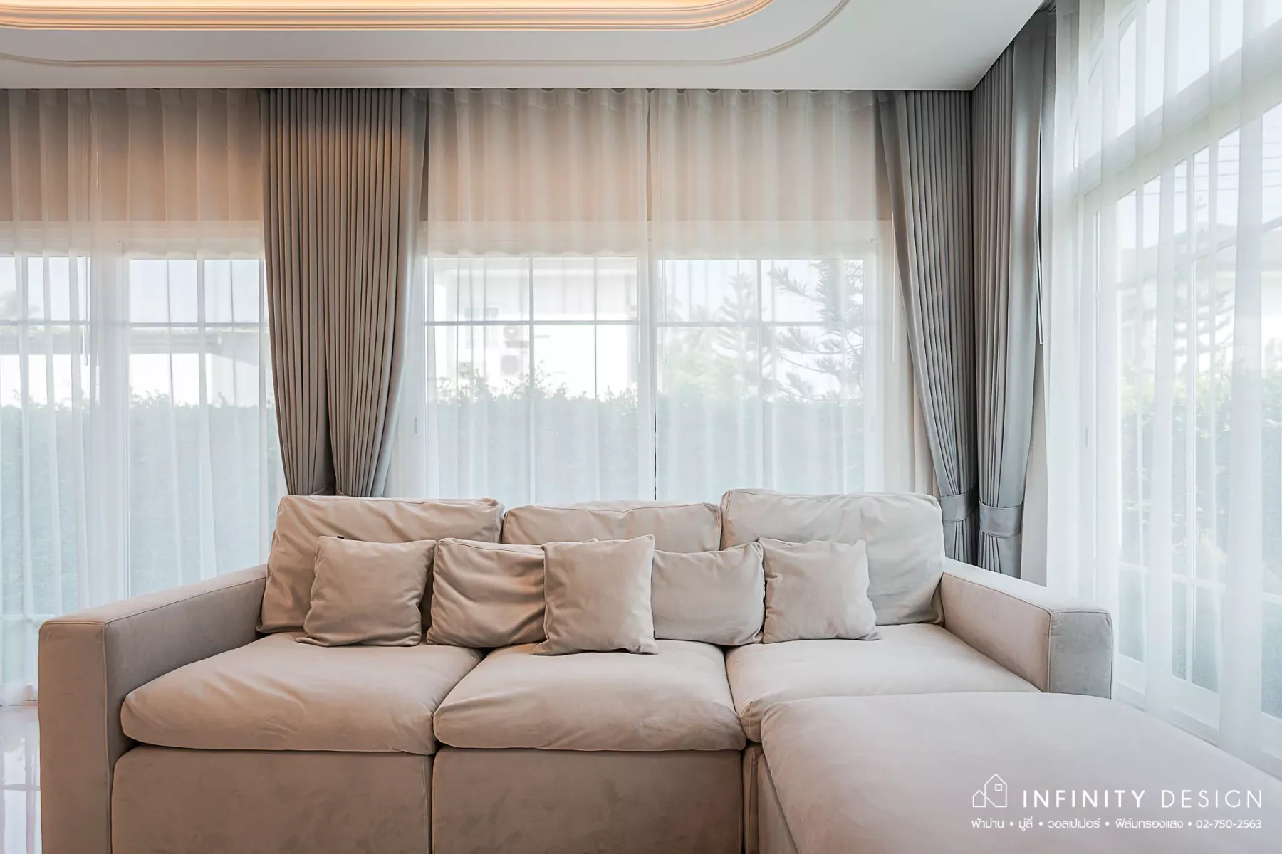 โดยบานหน้าต่างและประตูพื้นที่ชั้น 1 ทั้งหมดจะถูกป้องกันแสงแดดและเพิ่มความสวยงามด้วยเป็น ผ้าม่าน 2 ชั้น มีผ้าม่านกันแสงเพื่อปิดกั้นความเป็นส่วนตัวและแสงแดดจากภายนอก ส่วนผ้าม่านโปร่งจะช่วยพรางสายตา แต่ยังคงเห็นทิวทัศน์จากนอกหน้าต่างได้อย่างไม่อึดอัด