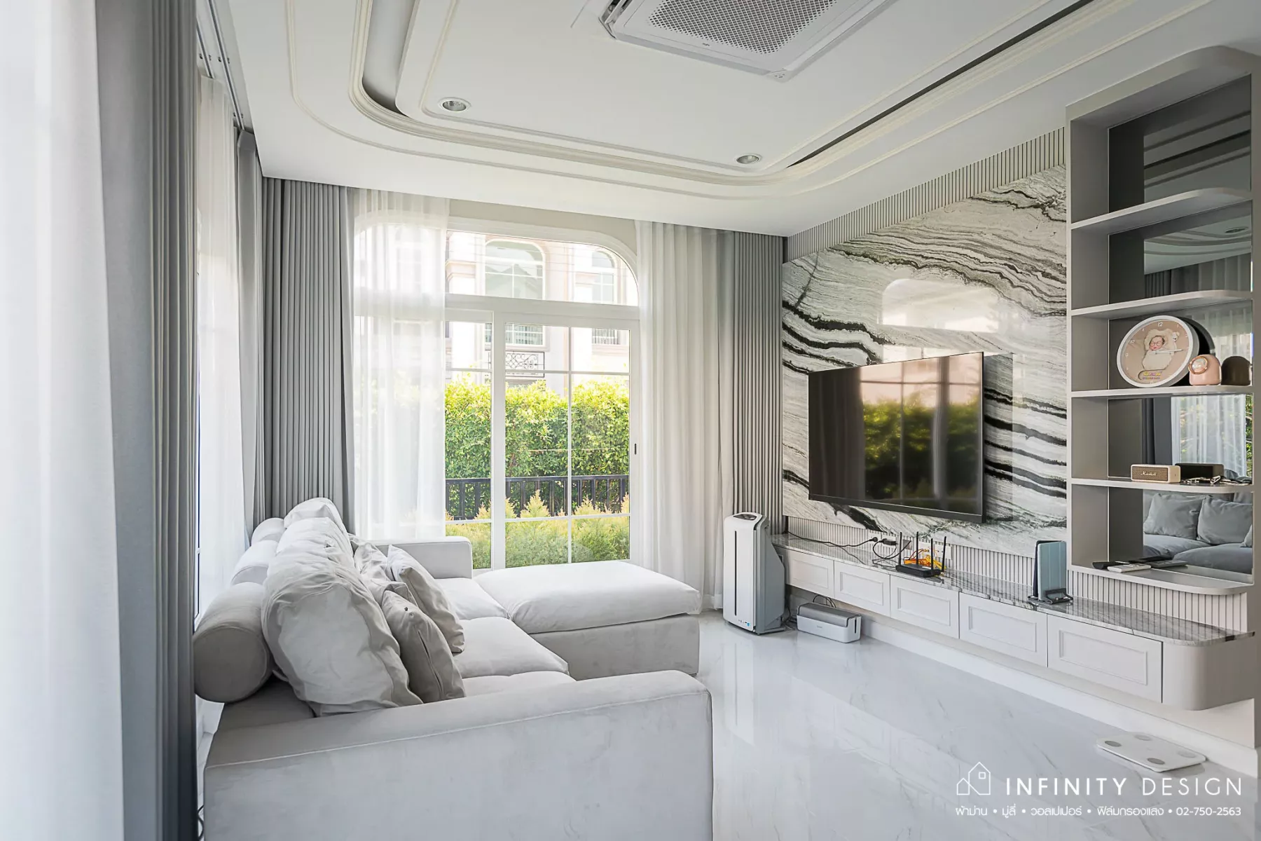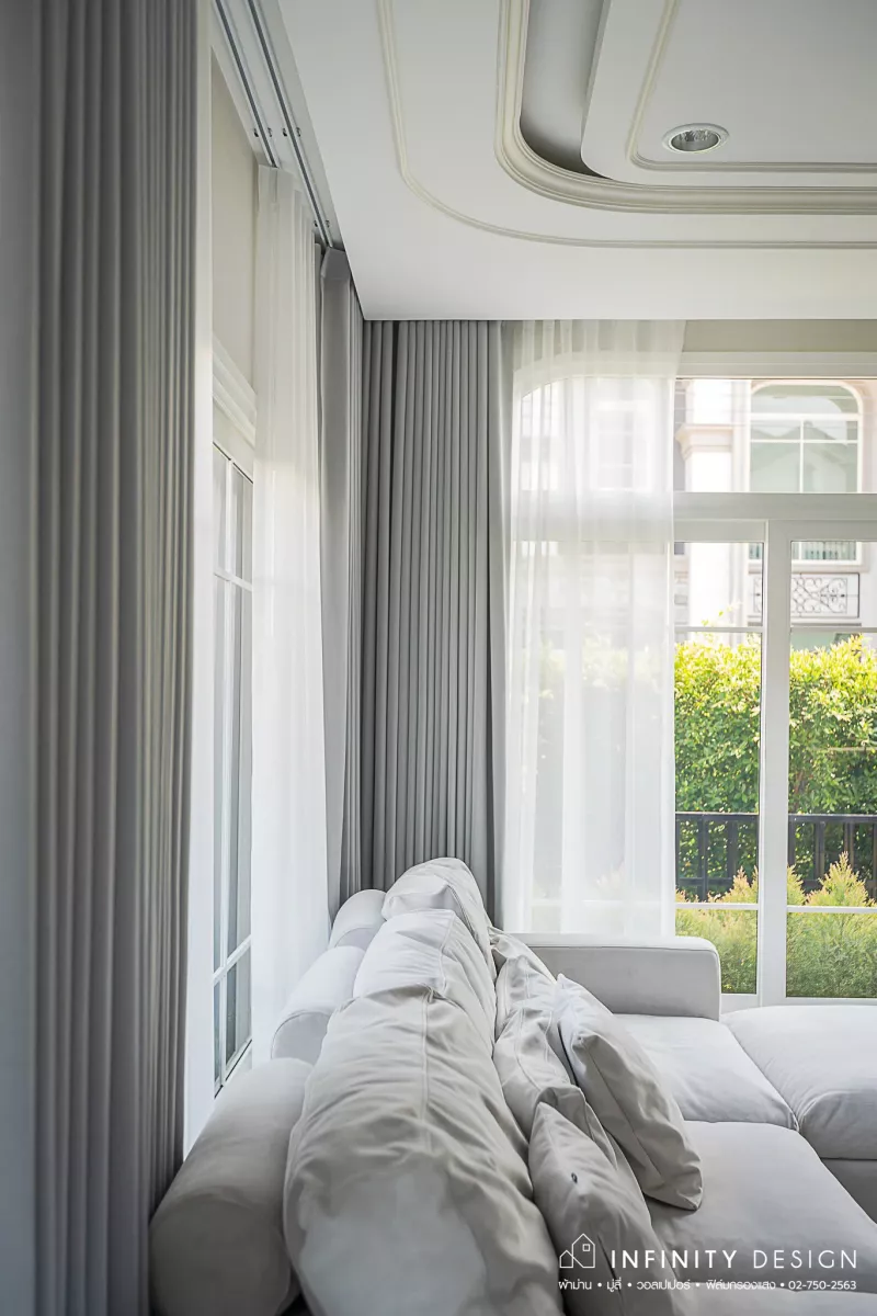 ผลงานการตกแต่งบ้าน Grandio สุขสวัสดิ์-พระราม 3 ภายนอกทางโครงการออกแบบสไตล์อังกฤษ แต่ภายในออกแบบสไตล์ Modern เรียบหรู ดูแพง แต่ไม่ต้องตะโกน โดย INFINITY DESIGN จะตกแต่งด้วย ผ้าม่าน (Curtain) แบบมี Texture โทนสีเทา และผ้าม่าน Blackout กันแสงอย่างดีในห้องนอน