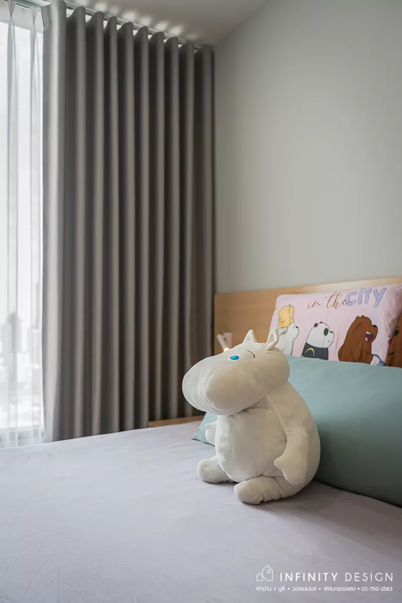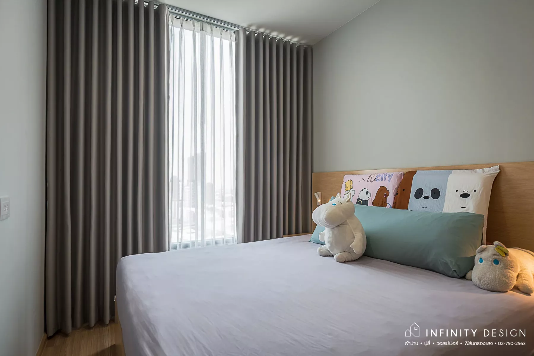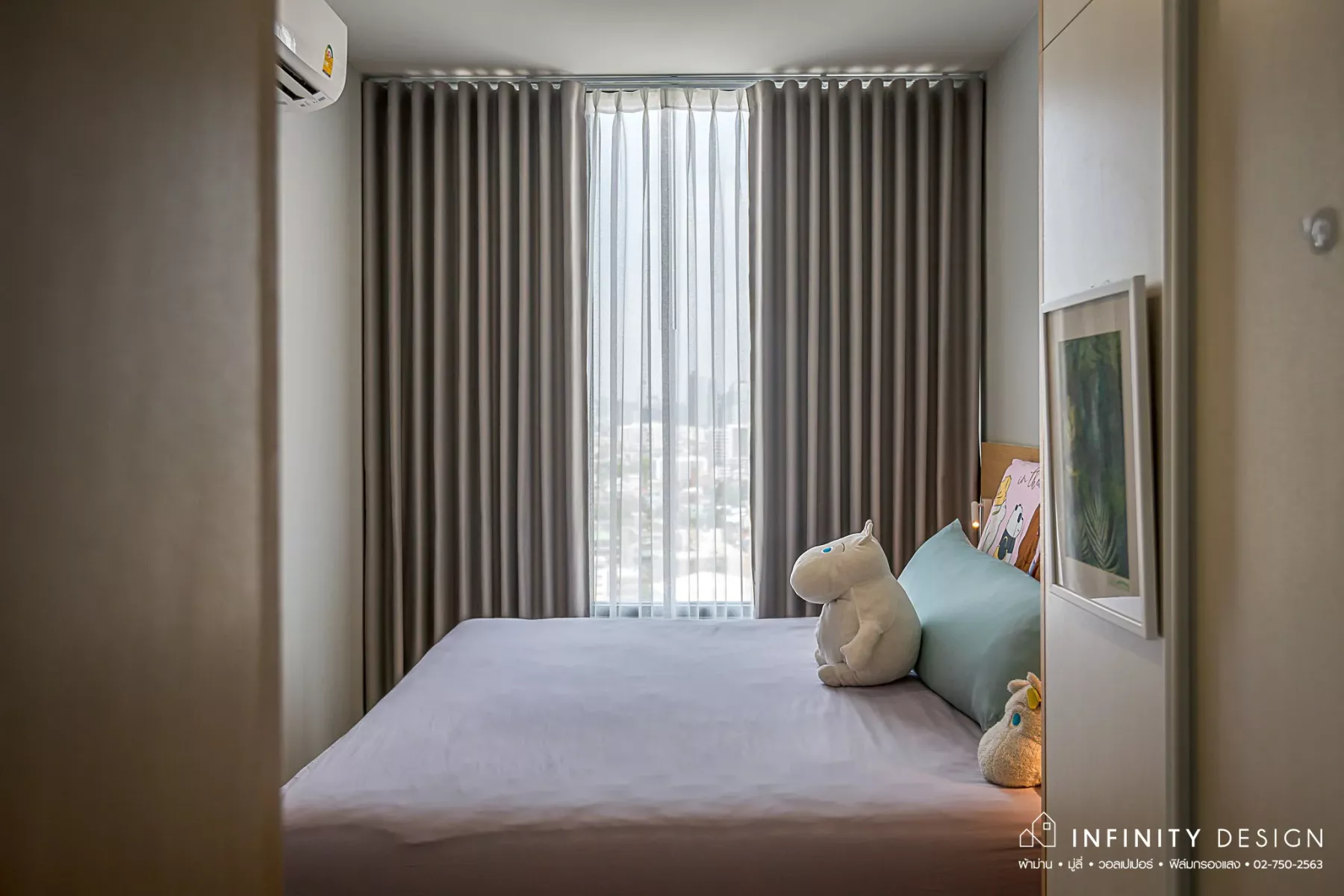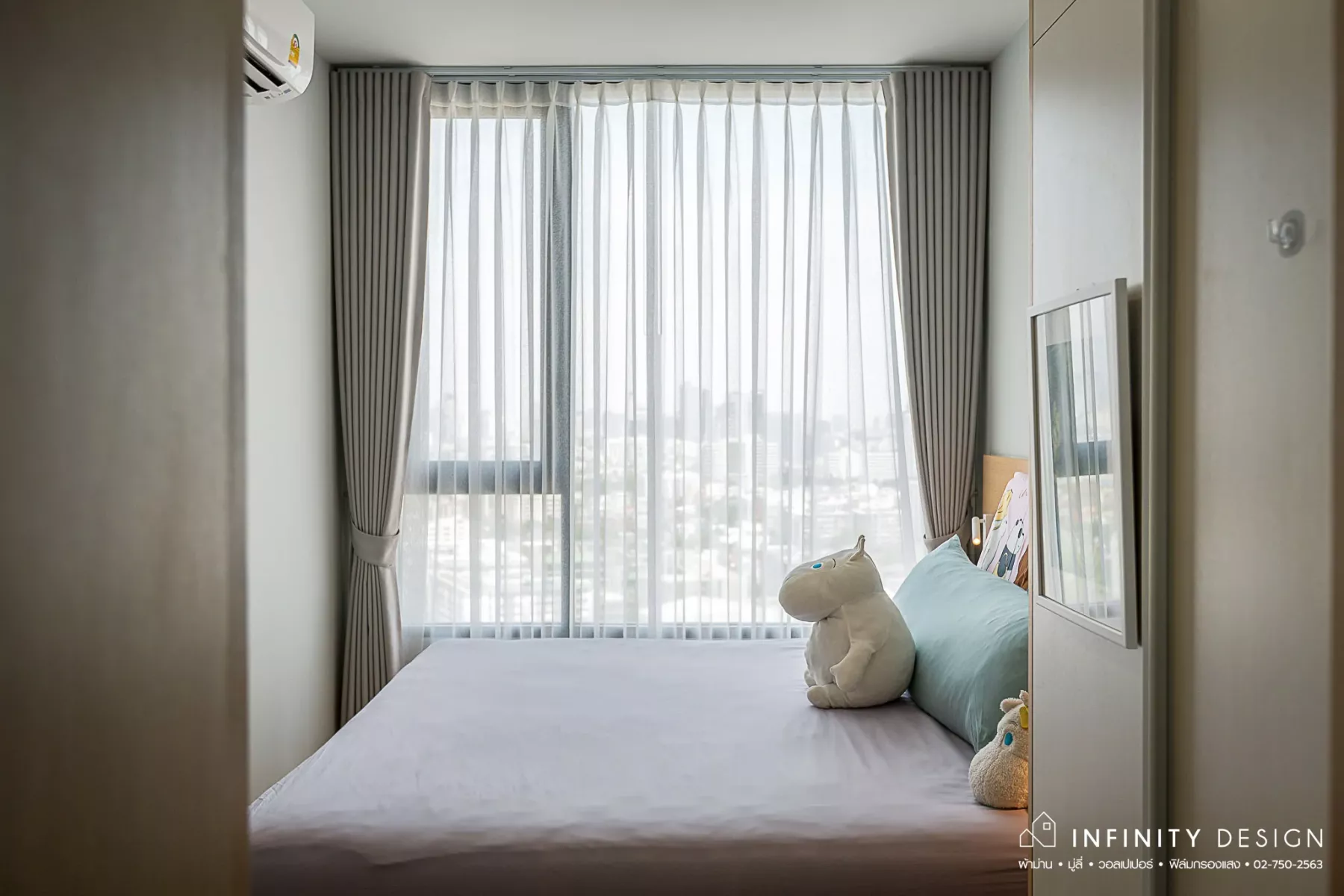 ผลงานการตกแต่งคอนโด Skyrise Avenue สุขุมวิท 64 ในแบบ Modern Minimal Style ที่ Infinity Design จะตกแต่งด้วยด้วย ผ้าม่าน (Curtain) โทนสีเทาอ่อน คู่กับผ้าม่านโปร่งพลิ้วๆ สีขาวครีม เน้นความเรียบง่าย สะอาดตา และทันสมัย