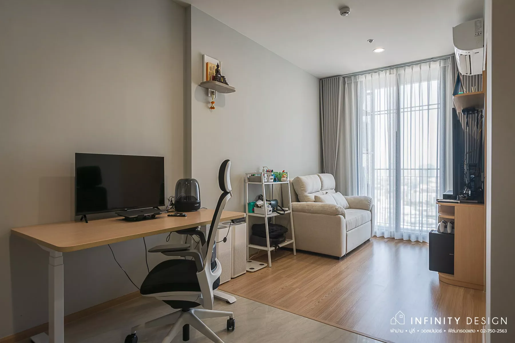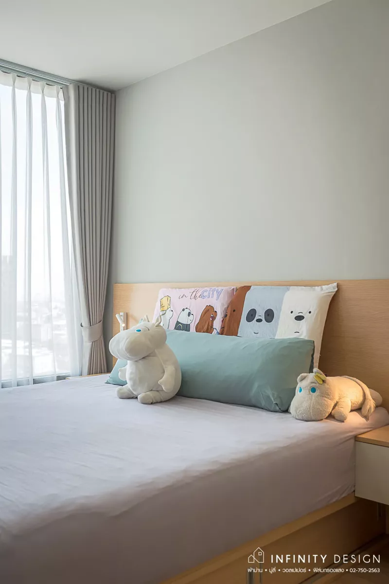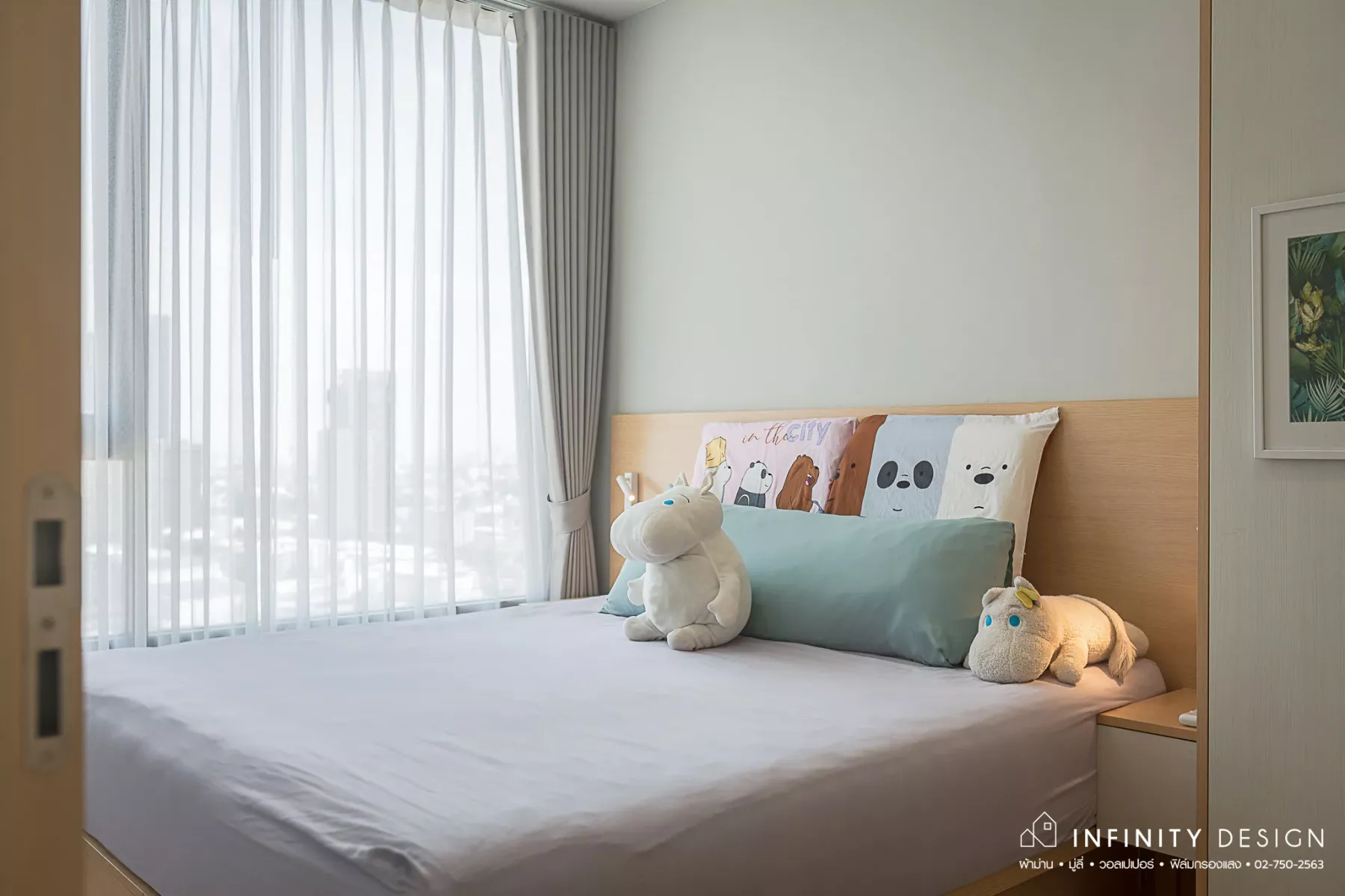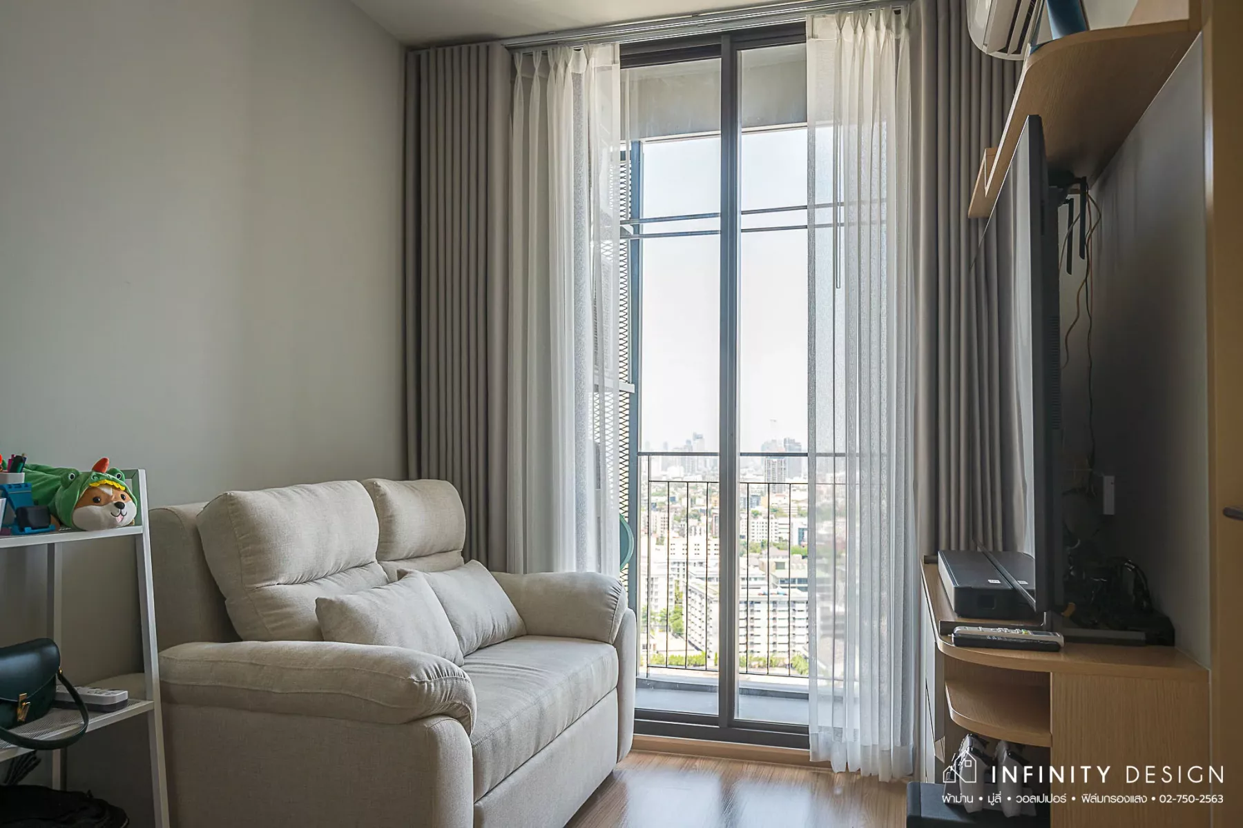 ผลงานการตกแต่งคอนโด Skyrise Avenue สุขุมวิท 64 ในแบบ Modern Minimal Style ที่ Infinity Design จะตกแต่งด้วยด้วย ผ้าม่าน (Curtain) โทนสีเทาอ่อน คู่กับผ้าม่านโปร่งพลิ้วๆ สีขาวครีม เน้นความเรียบง่าย สะอาดตา และทันสมัย