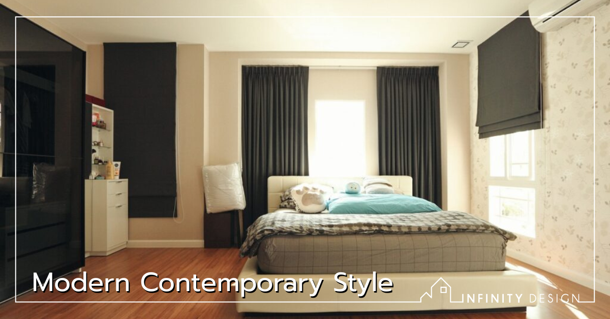 บ้านมัณฑนา พระราม 9 - ศรีนครินทร์ กับผลงานภาพตัวอย่างการตกแต่งบ้าน ในแบบ Modern Contemporary Style โทนสีกลาง (ขาว ดำ เทา น้ำตาล) ด้วยผ้าม่านจีบ ม่านพับ และมู่ลี่ไม้ จากพวกเราทีมงาน InfinityDesign ผ้าม่าน มู่ลี่ วอลเปเปอร์