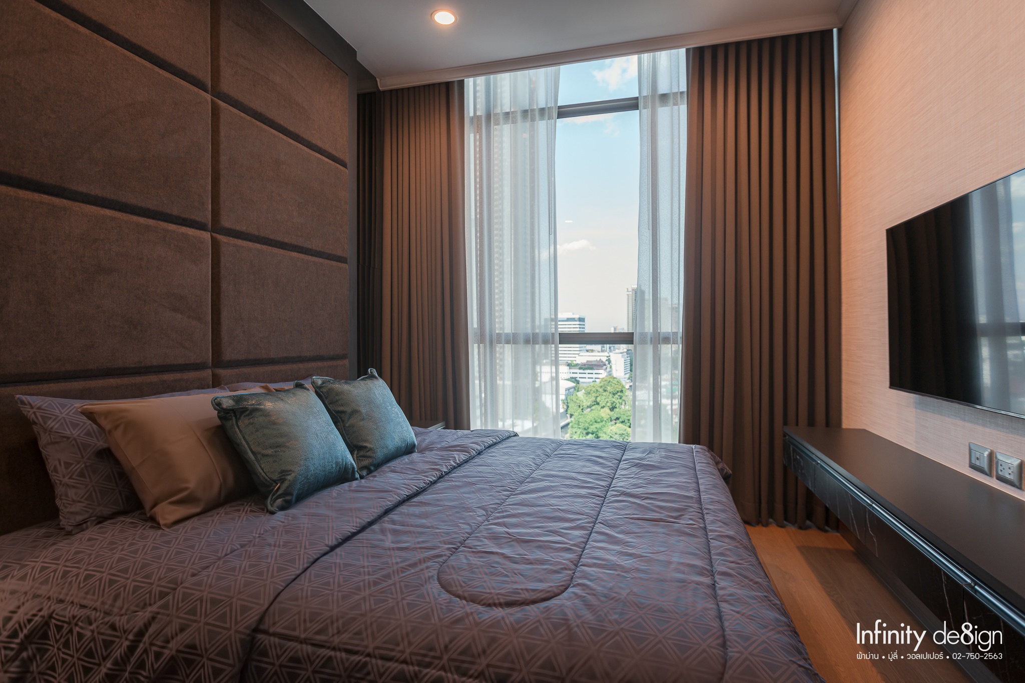 ห้องนอนใหญ่ตกแต่งด้วยผ้าม่าน สีเทาเข้ม @ Supalai Oriental สุขุมวิท 39
